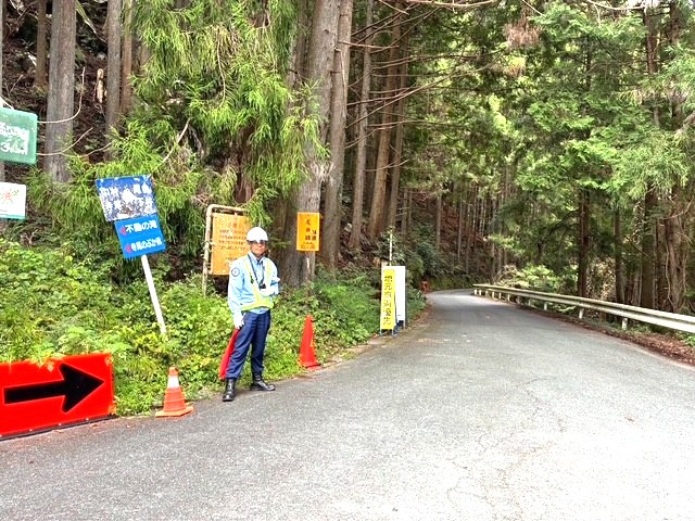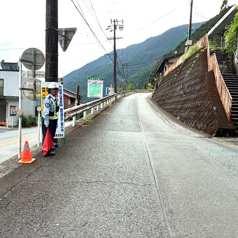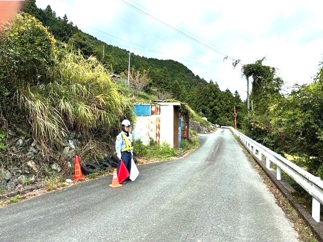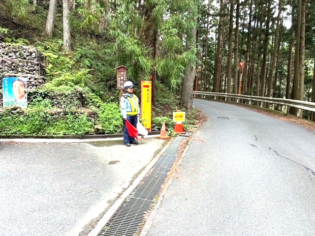 送電線工事に伴う山道での片側交互通行に関するパトロールを実施しました。通行箇所は、見通しの悪いカーブや脇道が点在しておりました。